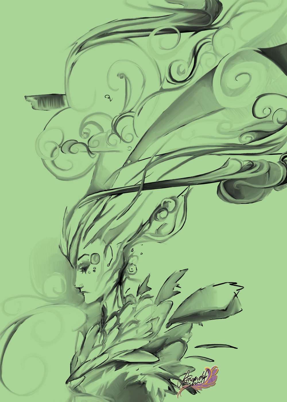 Monochromatic digital painting of an original character. Printed on 8.5"x11" 100lb Cover Stock Glossy Paper, artwork is roughly 5.75"x8".