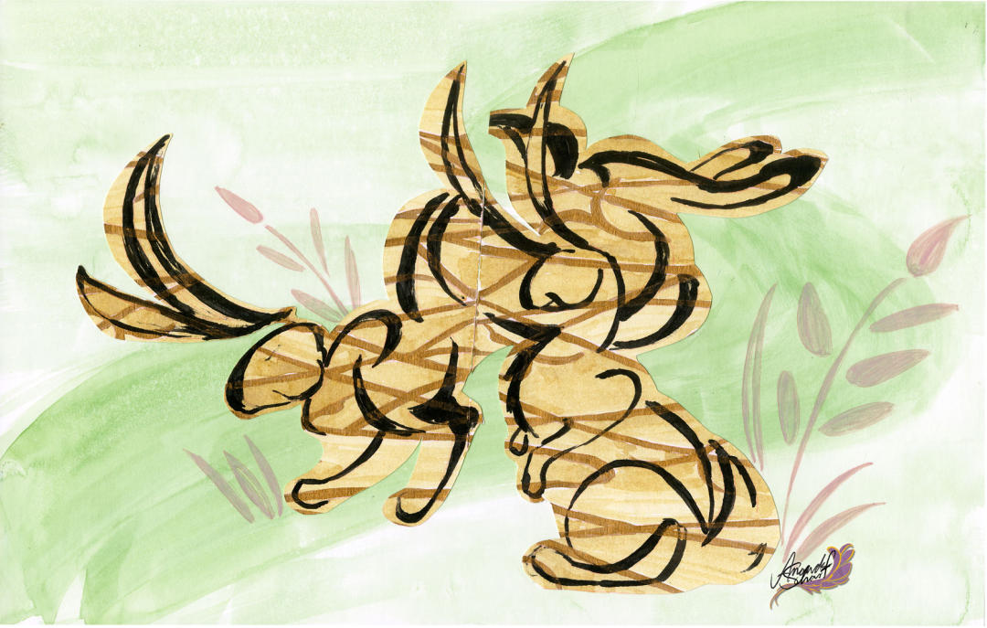Mixed media illustration of the Rabbit from the Chinese Zodiac. Companion pieces are “Year of the Tiger”, “Year of the Horse”, “Year of the Dragon”, and “Year of the Rooster”. Printed on 8.5"x11" and 12"x18" 51lb Epson Matte Paper, artwork is roughly 7"x10.75" and 11.5"x17.5", respectively.