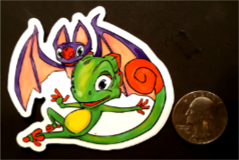 Featuring Yooka & Laylee from Yooka Laylee. 3” Die Cut sticker. Great for decorating journals, laptops, and waterbottles. Can be run through the dishwasher. Next to quarter for size reference.